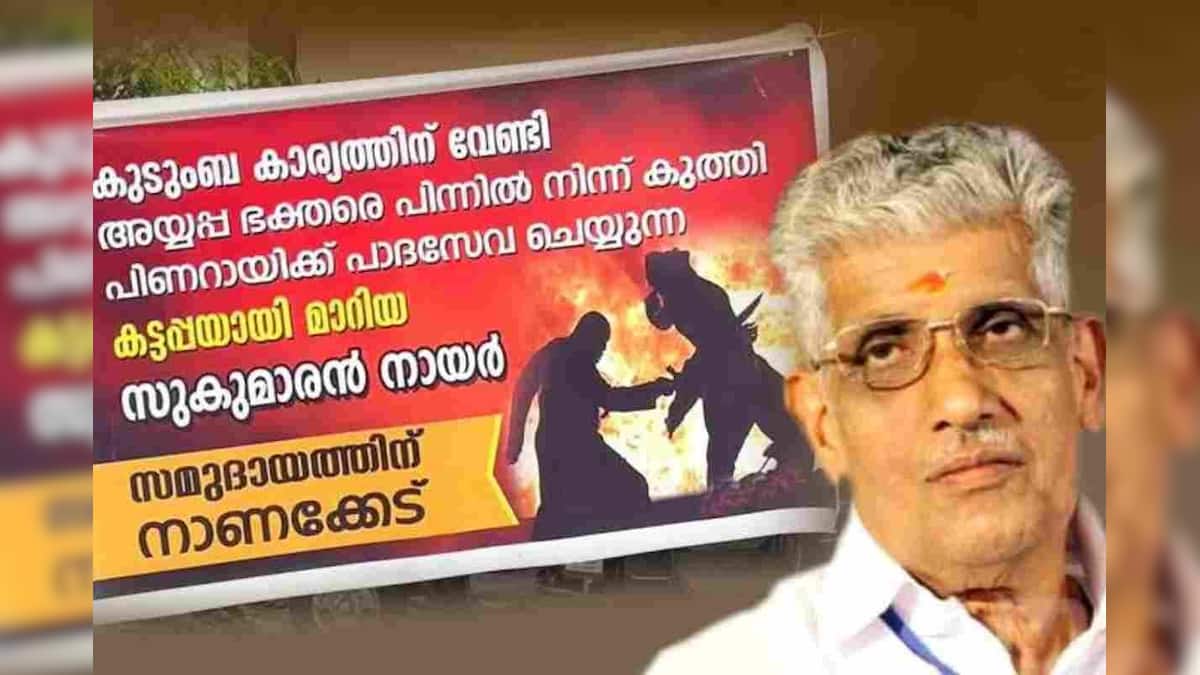 ‘സുകുമാരൻ നായർ കട്ടപ്പ, കുടുംബ കാര്യത്തിനുവേണ്ടി അയ്യപ്പഭക്തരെ പിന്നിൽ നിന്നു കുത്തി’; കരയോഗത്തിന് മുന്നിൽ ബാനർ