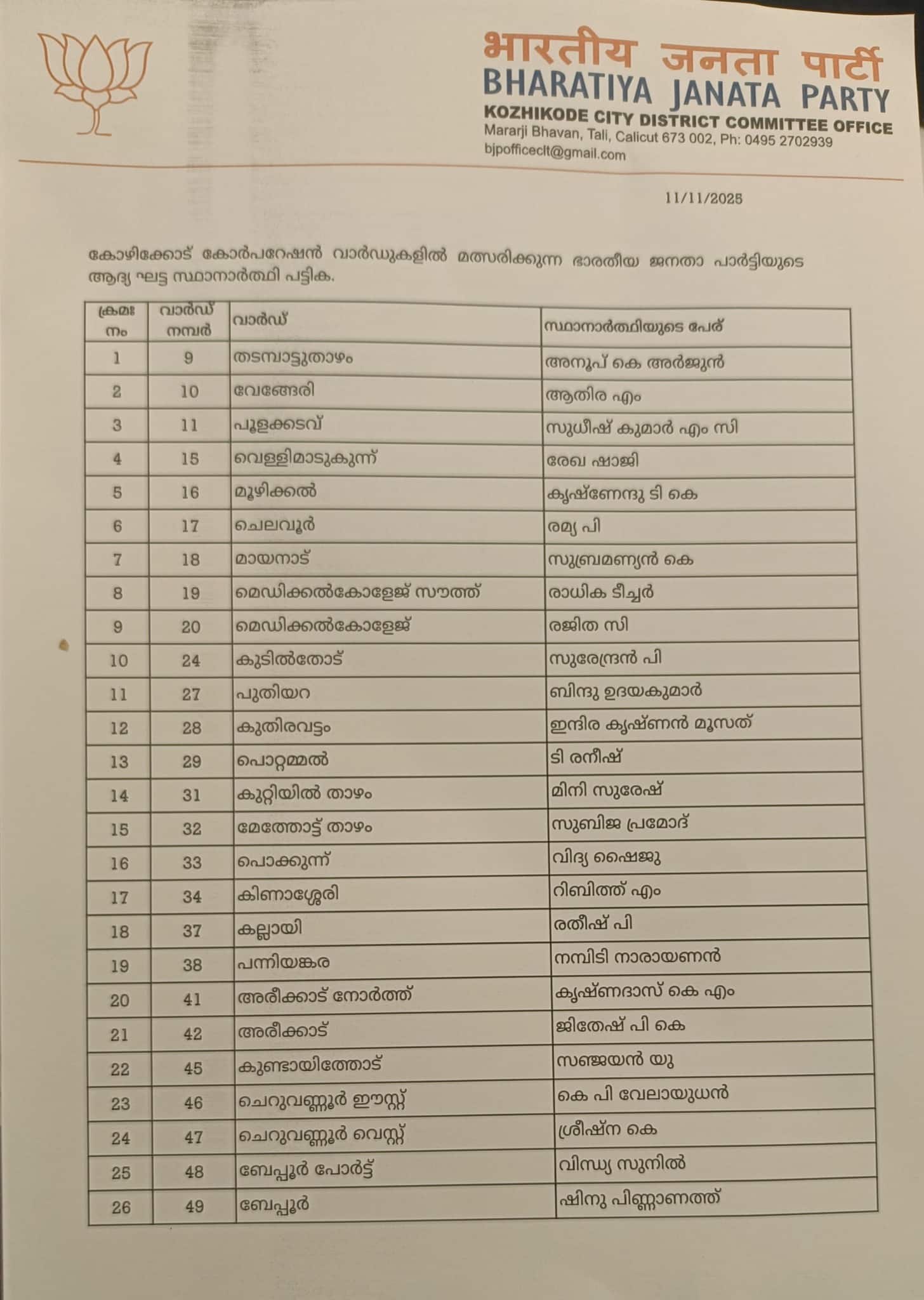 കോഴിക്കോട് കോർപറേഷനില് ബിജെപി ആദ്യഘട്ടത്തിൽ 45 സ്ഥാനാർത്ഥികളെ പ്രഖ്യാപിച്ചു; 28 വനിതകൾ| BJP Announces First List of 45 Candidates for Kozhikode Corporation Polls 28 Women Included | Kerala