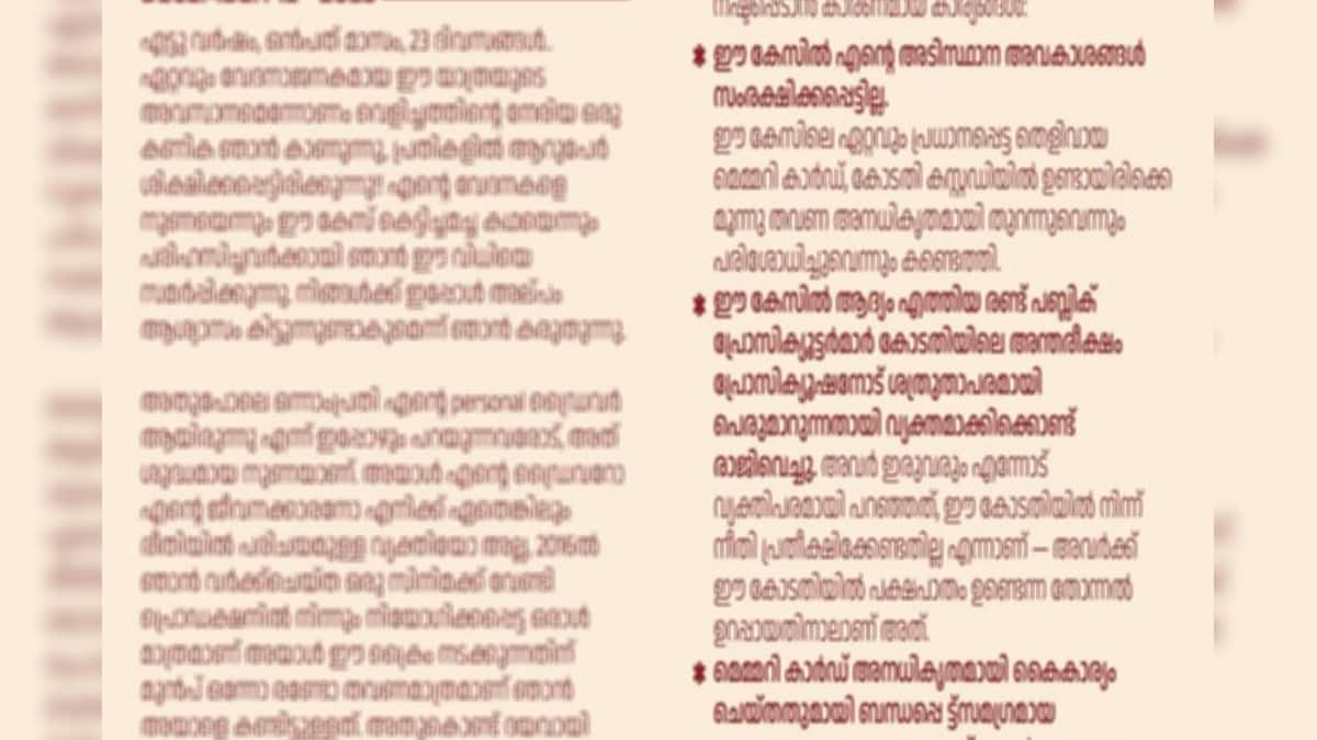 * എൻ്റെ ആശങ്കകളും അനുഭവങ്ങളും അറിയിച്ച് ബഹുമാനപ്പെട്ട രാഷ്ട്രപതിക്കും, ബഹുമാനപ്പെട്ട പ്രധാനമന്ത്രിക്കും, ബഹുമാനപ്പെട്ട സുപ്രീം കോടതി ചീഫ് ജസ്റ്റിസിനും എനിക്ക് കത്തുകൾ അയക്കേണ്ടതായും വന്നിട്ടുണ്ട്.