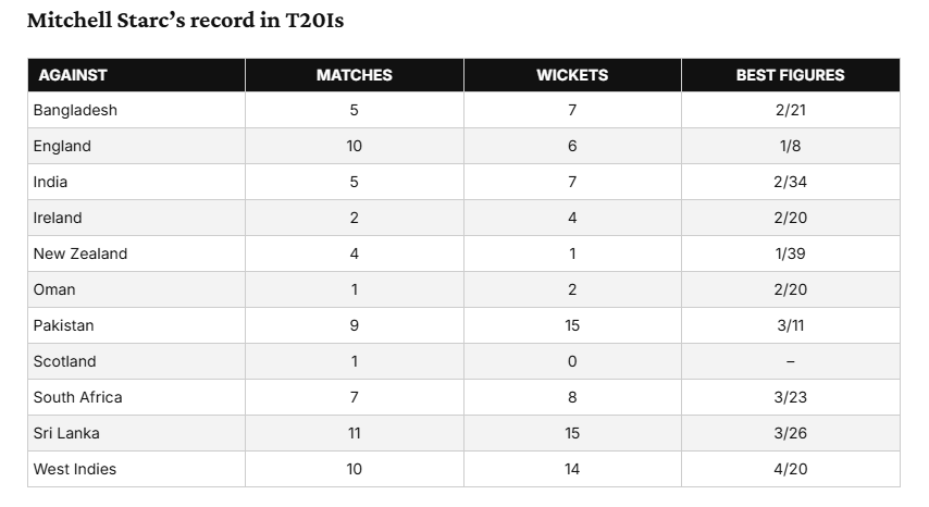 2012 സെപ്റ്റംബറില് പാകിസ്താനെതിരേയാണ് താരം ടി20യില് അരങ്ങേറുന്നത്. പിന്നീടങ്ങോട്ട് ഓസീസ് ബൗളിങ് നിരയുടെ കരുത്തുറ്റ സാന്നിധ്യമായി സ്റ്റാര്ക്ക് മാറി. 65 മത്സരങ്ങളില് നിന്ന് 79 വിക്കറ്റുകള് നേടി. കഴിഞ്ഞവര്ഷം ഇന്ത്യക്കെതിരേയാണ് അവസാനമായി ടി20 കളിക്കുന്നത്.
