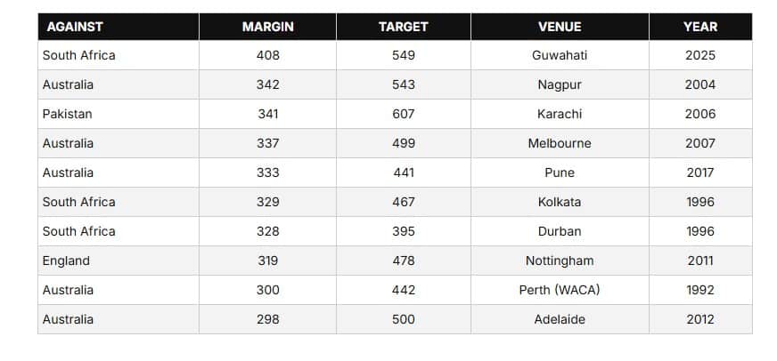 ബർസപ്പാറ ക്രിക്കറ്റ് സ്റ്റേഡിയത്തിലെ 408 റൺസിന്റെ ഈ തോൽവി, റൺസിന്റെ മാർജിനിലുള്ള ടെസ്റ്റ് മത്സരങ്ങളിൽ ഇന്ത്യയുടെ ഏറ്റവും വലിയ തോൽവിയാണ്. റൺസിന്റെ മാർജിനിലുള്ള ഇന്ത്യയുടെ ഇതിന് മുൻപുള്ള ഏറ്റവും വലിയ തോൽവി 2004-ൽ നാഗ്പൂരിൽ ഓസ്ട്രേലിയക്കെതിരെ 342 റൺസിനായിരുന്നു.