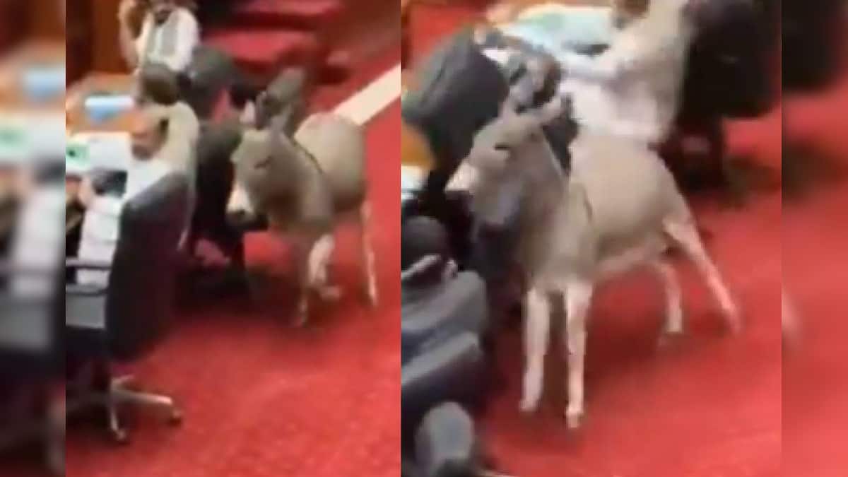 വിചിത്രവും രസകരവുമായ സംഭവമാണ് അടുത്തിടെ പാകിസ്ഥാൻ പാർലമെന്റിൽ അരങ്ങേറിയത്. പാർലമെന്റിന്റെ തത്സമയ സെഷനിലിടെ ഒരു കഴുത അപ്രതീക്ഷിതമായി സെനറ്റ് ചേംബറിൽ പ്രവേശിച്ചു. പാർലമന്റ് ഹാളിലേക്ക് പെട്ടെന്നുള്ള കഴുതയുടെ രംഗപ്രവേശനം അംഗങ്ങളിൽ ഒരുപോലെ ഞെട്ടലും ചിരിയും പടർത്തി. പാർമെന്റിൽ ചർച്ച നടക്കുന്നതിനിടെ കസേരകളും മറ്റും തള്ളിമറിച്ചുകൊണ്ട് കഴുത ഓടിക്കയറുകയായിരുന്നു.